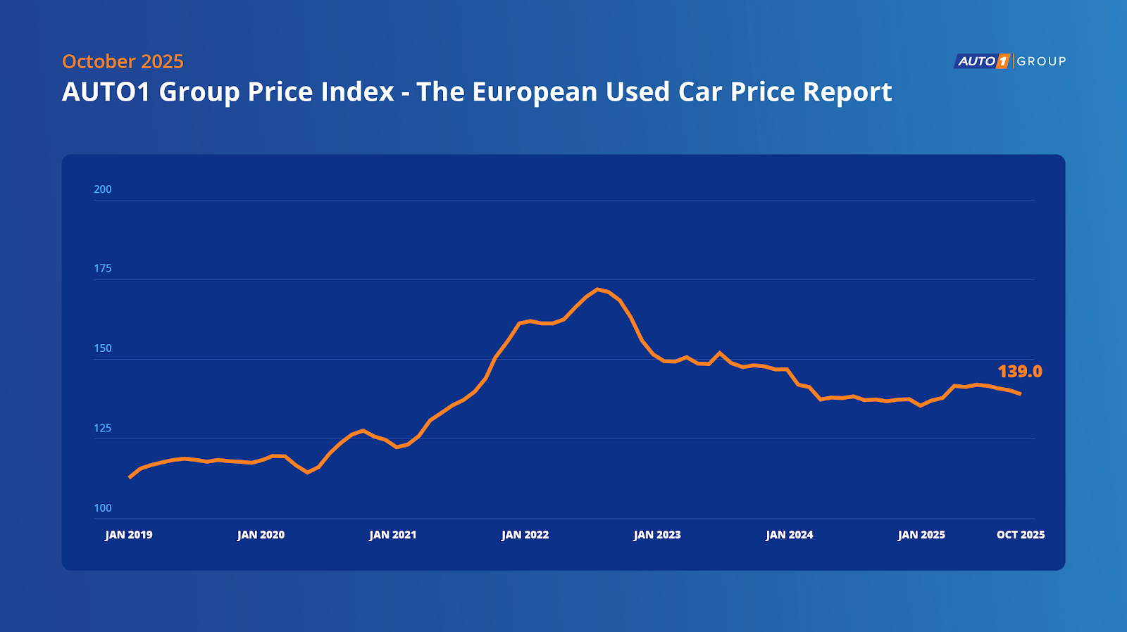 De nieuwste Auto1 Group Prijsindex laat in oktober 2025 opnieuw een lichte daling zien, van 140,1 naar 139,0 punten (-0,8%). Daarmee daalt de index voor de vierde maand op rij, al liggen de prijzen nog altijd 1,5 procent hoger dan in oktober 2024.