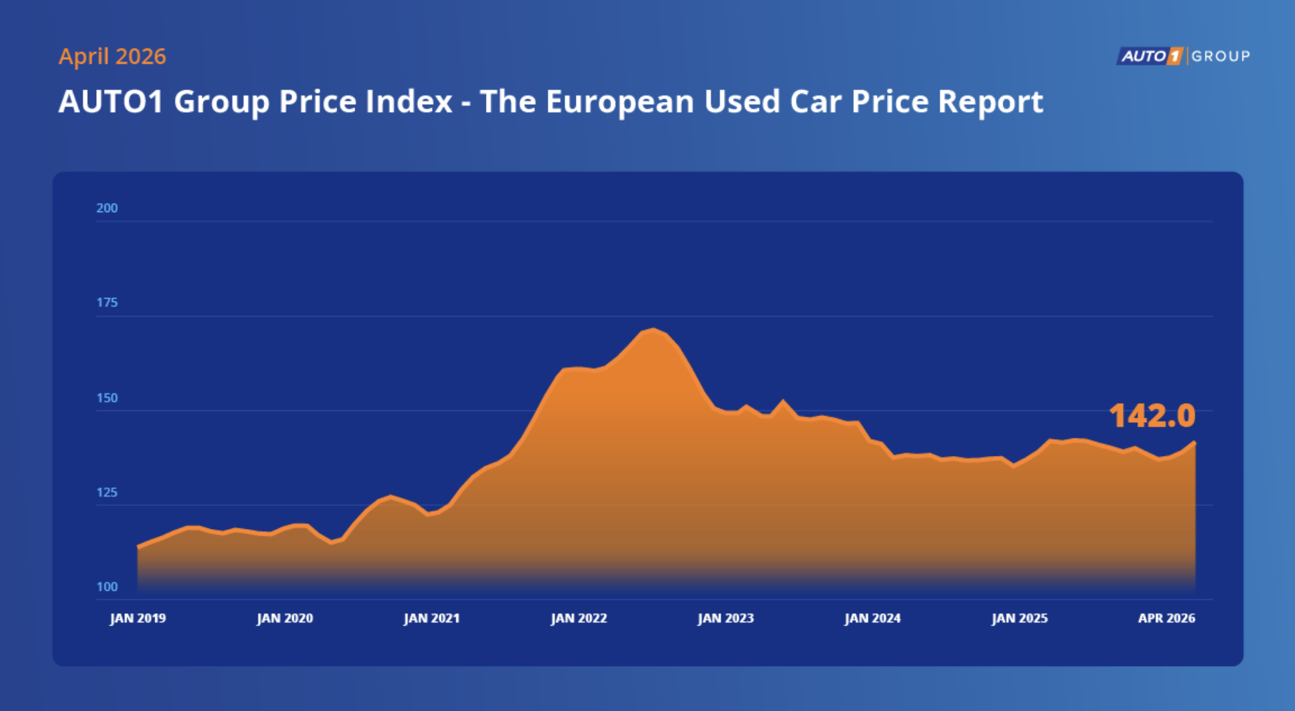 De Auto1 Group Prijsindex voor tweedehands auto’s in Europa is in april 2026 gestegen naar 142,0, dat meldt Auto1 Group, een van de grootste handelsbedrijven van Europa. In maart stond de index nog op 139,3, wat neerkomt op een stijging van 1,9 procent op maandbasis.