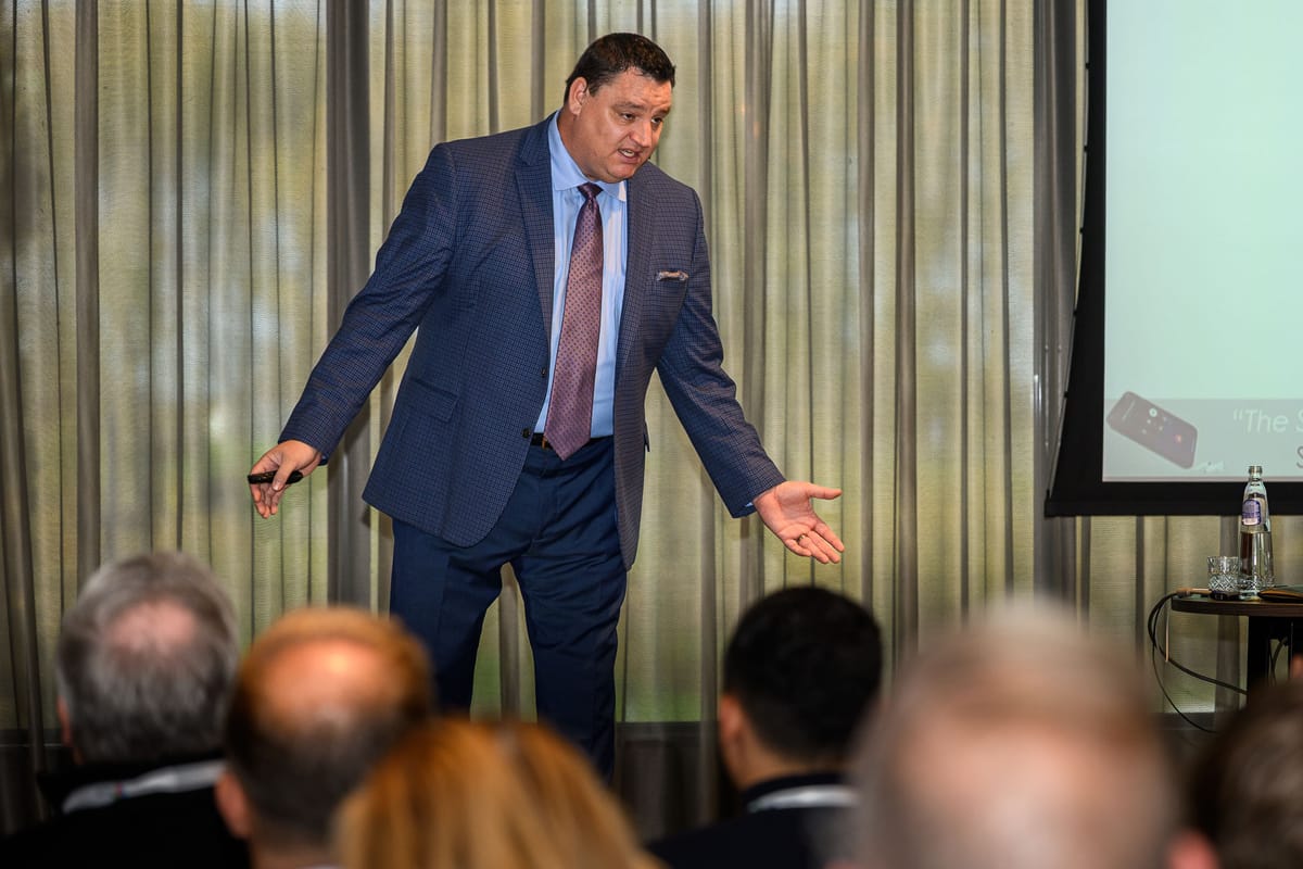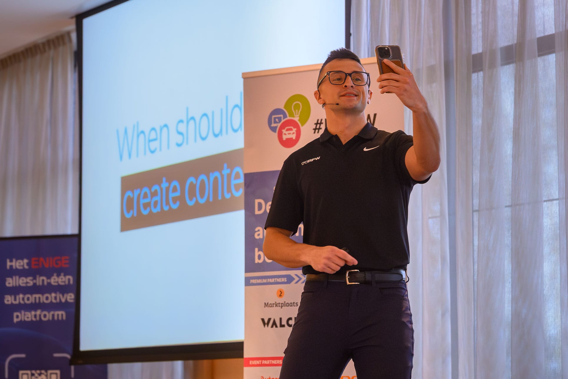 Deze keer was het de beurt aan social media-goeroe Russel Richardson (#russflipswhips). Ook Richardson vindt (veel) adverteren onnodig. Hij kwam de zaal uitleggen hoe een verkoper zijn persoonlijke brand bouwt op social media. Social media was de rode draad door de dag heen. Nederlandse autobedrijven gebruiken dat overigens volstrekt anders dan Richardson het voor zich ziet, ze adverteren er vooral. Belangrijkste conclusie: social media-leads zijn zelden rijp om opgevolgd te worden. Die moeten eerst nog door marketing bewerkt worden, voor ze ooit rijp zijn voor de verkoopafdeling.