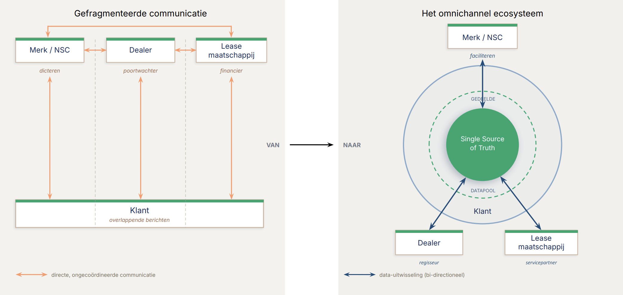 En daar wringt de schoen. Terwijl het merk wil centraliseren om de klantervaring te verbeteren, zien dealers, financierings- en leasemaatschappijen diezelfde klant als hun exclusieve relatie. Wat voor de klant een logische verbetering zou zijn, ontaardt achter de schermen in een bittere strijd om bezit van en controle over klantdata, met meerdere ‘waarheden’ tot gevolg. Zolang deze partijen onafhankelijk van elkaar blijven vechten om de aandacht van de klant, blijft de omnichannel-ervaring slechts een belofte.