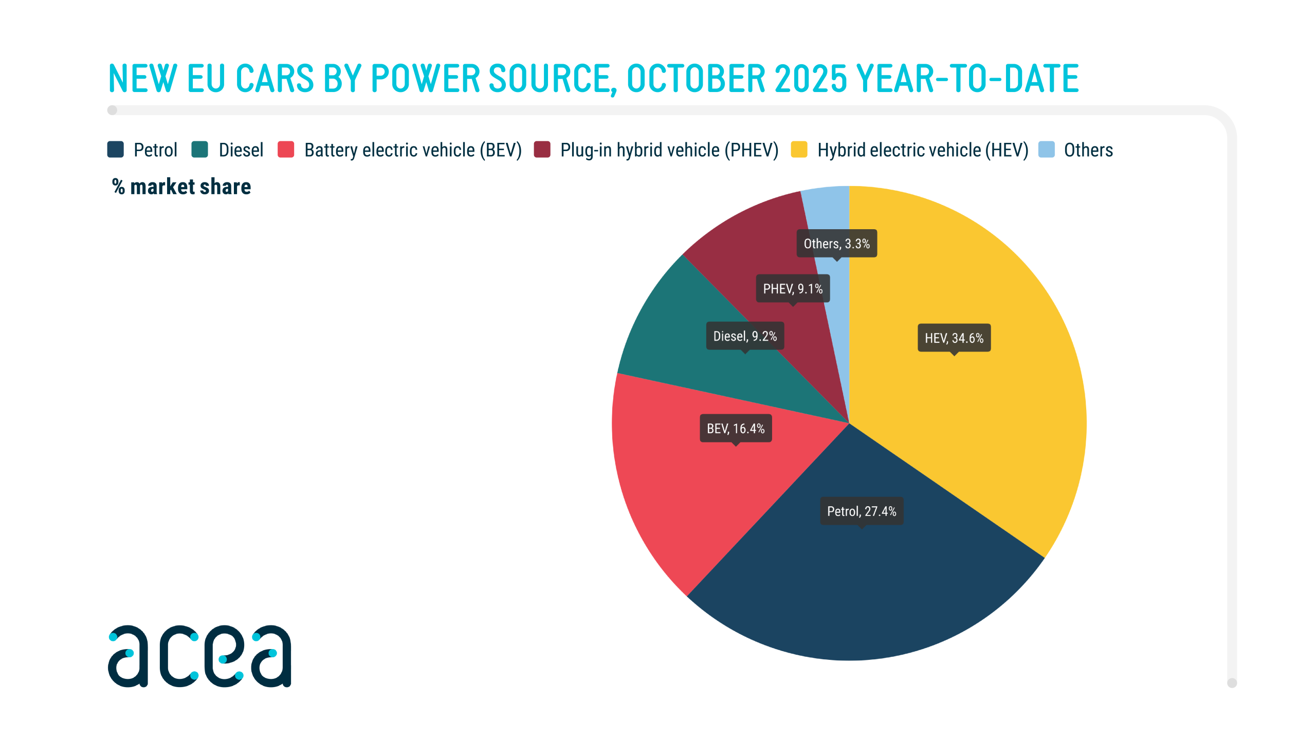 Waar het marktaandeel van hybrides en plugin-hybrides groeit, daalt het van auto's die enkel een verbrandingsmotor hebben. Eind oktober 2025 lagen de registraties van benzineauto’s in de EU 18,3 procent lager dan een jaar eerder. Het marktaandeel van benzine daalde naar 27,4 procent, tegen 34 procent een jaar eerder. De dieselmarkt kromp met 24,5 procent, wat neerkomt op een marktaandeel van 9,2 procent over 2025.