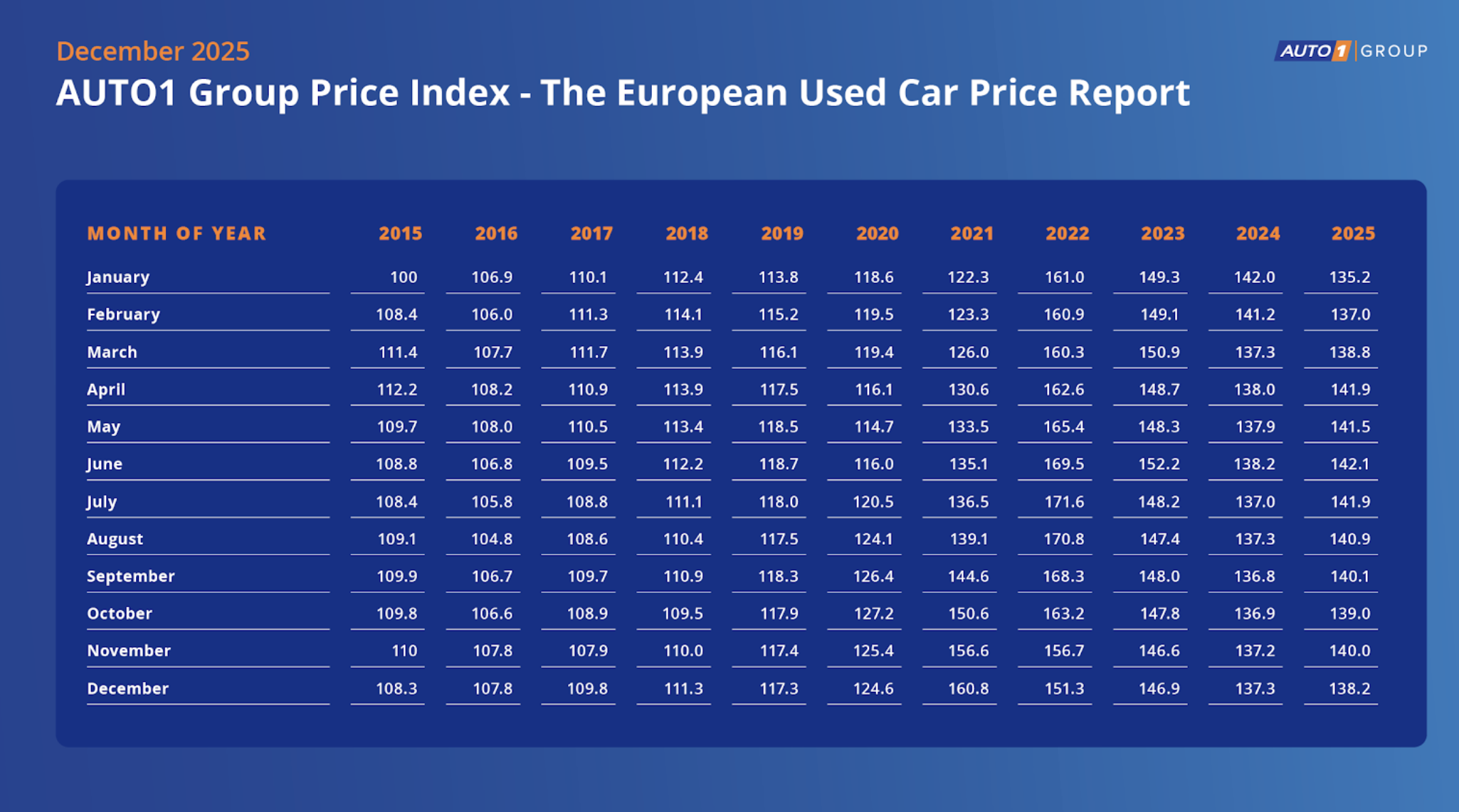 De Auto1 Prijsindex eindigde het jaar op 138,2, een stijging van 0,7 procent ten opzichte van december 2024. Dat meldt het remarketingbedrijf, dat bekend is van onder meer wijkopenauto's.nl.