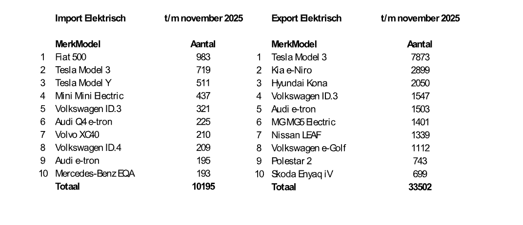 Ingezoomd op elektrische personenauto’s zien we een import van 10.195 en een export van 33.502 stuks, dus ruim 23.000 meer het land uit dan erin.