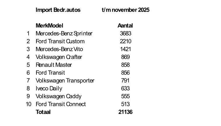 In de bedrijfsautomarkt is het beeld volledig anders. De nieuwverkopen liggen meer dan 80 procent lager dan in 2024. Sinds het vervallen van de BPM-vrijstelling per 2025 worden vrijwel geen bedrijfswagens met verbrandingsmotor meer verkocht; 77 procent van de nieuwverkopen is elektrisch. De uitzonderlijk sterke verkooppiek eind 2024 compenseert dit deels, maar in de bedrijfsvoorraden staan nog veel voertuigen uit bouwjaar 2024.