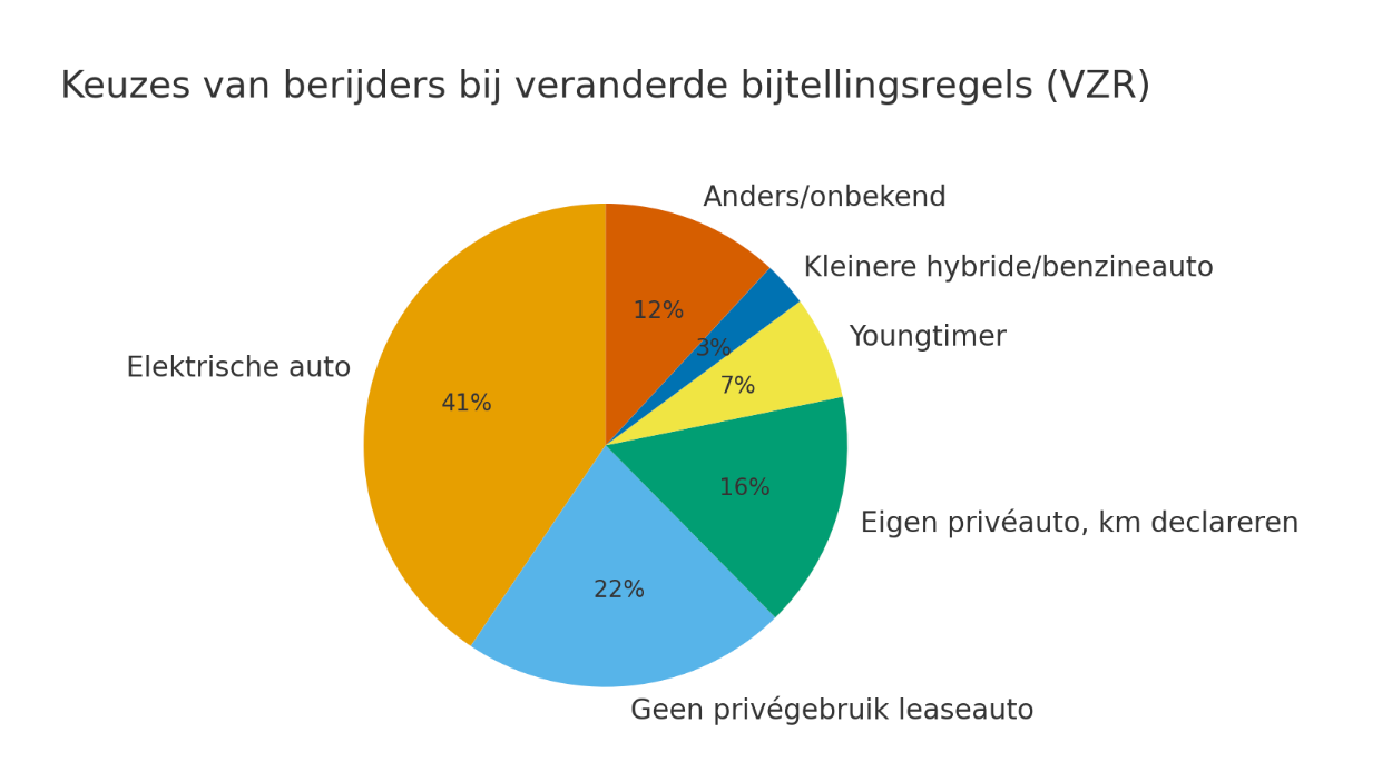 VZR vroeg de berijders wat zij gaan doen als er een 12% strafbelasting komt op het rijden van een auto op fossiele brandstof. Op die vraag beantwoord 59% van de zakelijk rijders dat ze een alternatief gaan zoeken, in plaats van over te stappen op een volledig elektrische auto.